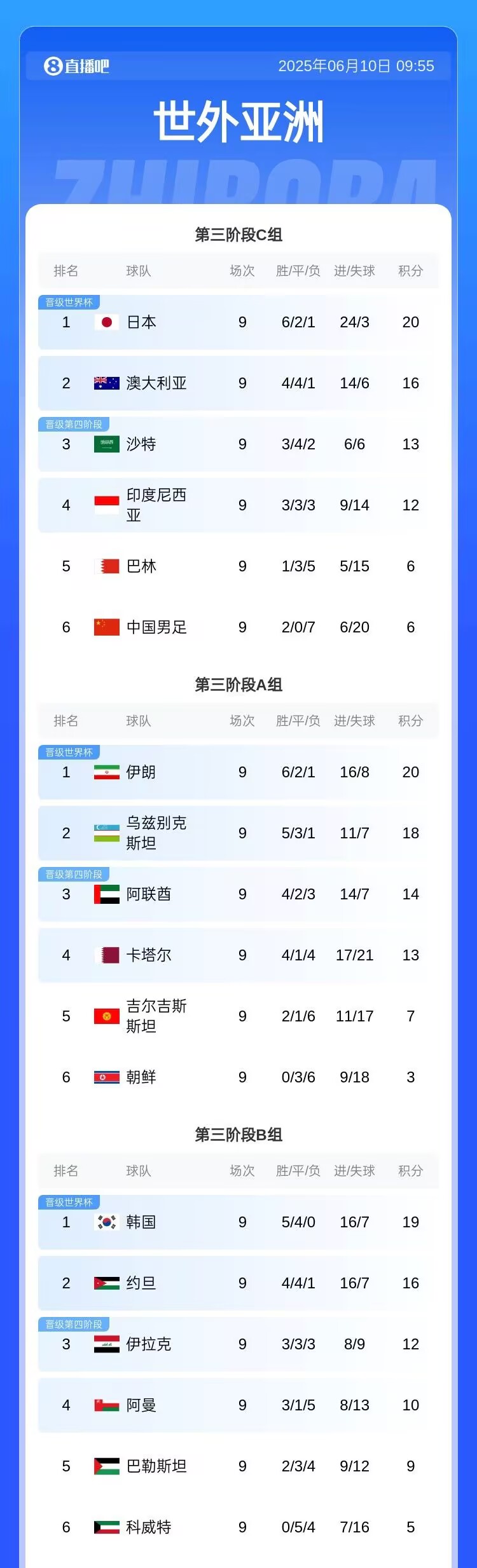 06月10日訊 世預賽亞洲區第三階段末輪將在今日至明晨全部收官,目前亞洲區僅剩最后一席直通美加墨世界杯的名額。