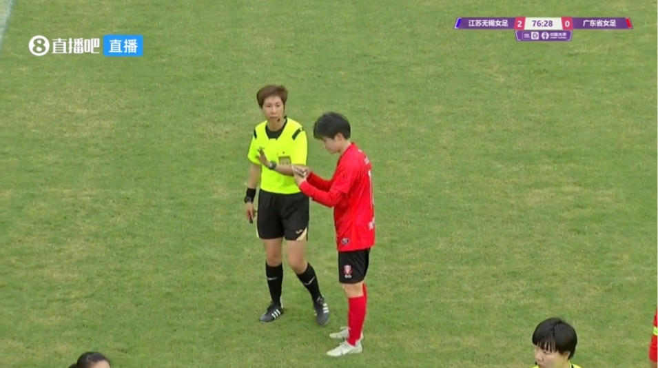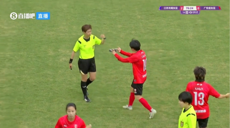 江蘇無(wú)錫女足隨后發(fā)起反擊并再次打入一球后,廣東女足進(jìn)行抗議。雙方中斷了比賽,中途一名廣東球員拿出手機跑向主裁,試圖證明之前發(fā)生的那一球應算有效,裁判看了一眼后揮手維持原判(視頻3:30處)。