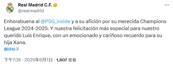 06月01日訊 皇馬官推祝賀巴黎奪得2024/25賽季歐冠冠軍。