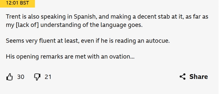 BBC實(shí)時(shí)博客更新了一段文字:阿諾德也會(huì )說(shuō)西語(yǔ),而且就我對這門(mén)語(yǔ)言的理解,他已經(jīng)說(shuō)得不錯了,至少聽(tīng)起來(lái)非常流利,即使他在看提詞器。他的開(kāi)場(chǎng)白也贏(yíng)得了熱烈的掌聲。