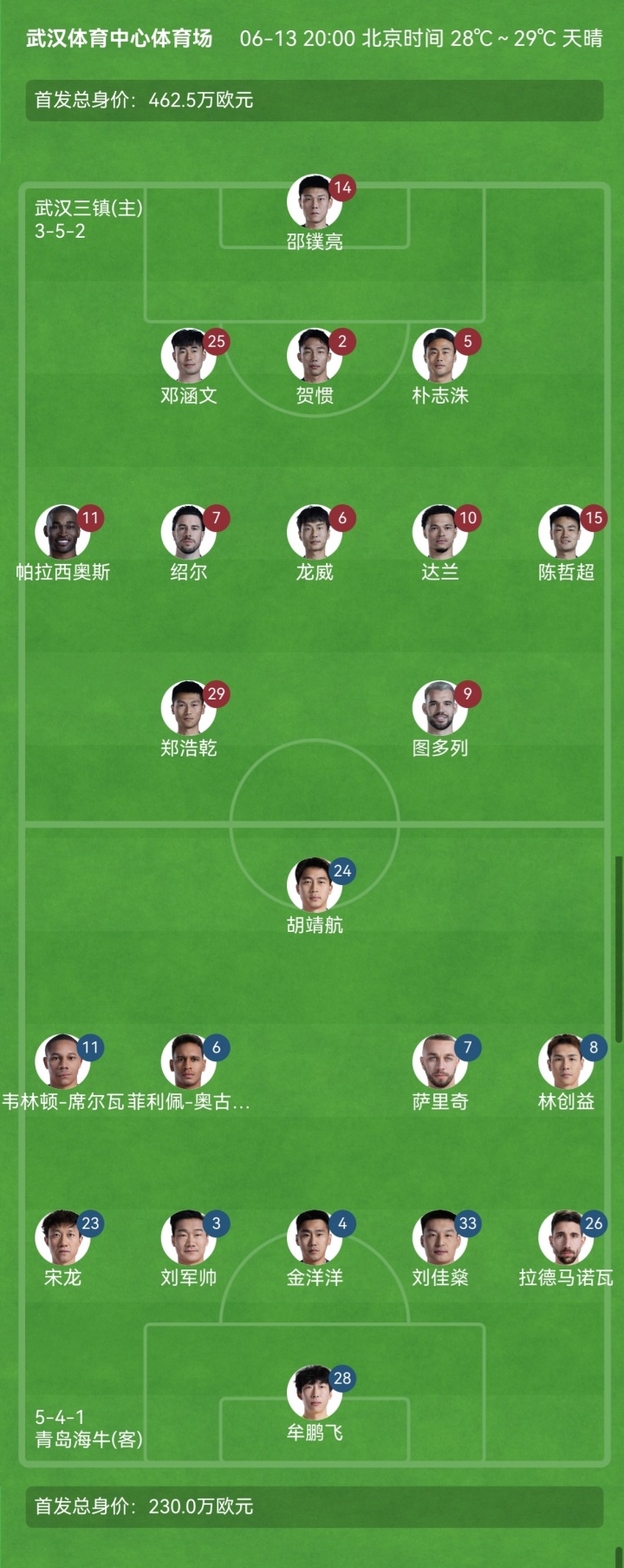 06月13日訊 北京時(shí)間20點(diǎn),中超第14輪,武漢三鎮主場(chǎng)迎戰青島海牛。賽前,雙方首發(fā)出爐。