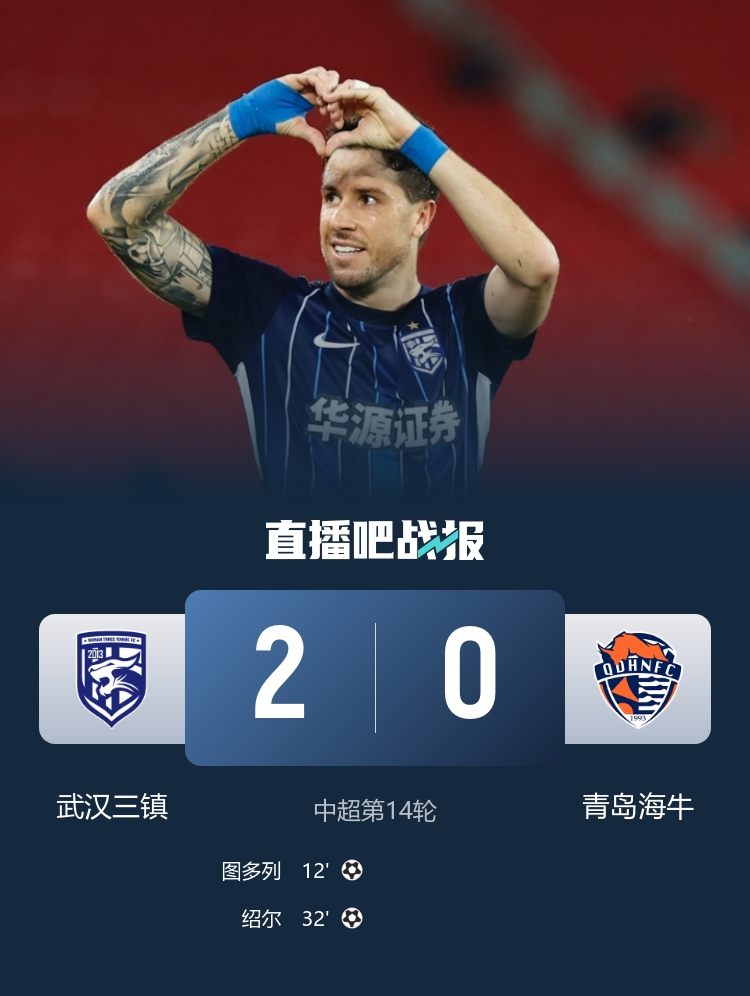 第12分鐘,帕拉西奧斯左邊路突破下底傳中,禁區內圖多列從容停球彈射破門(mén)!武漢三鎮1-0領(lǐng)先青島海?!?/strong>