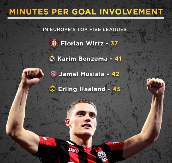 2021-22賽季,當時(shí)只有18歲的維爾茨在賽季開(kāi)局階段,創(chuàng )造出每37分鐘就帶來(lái)1個(gè)進(jìn)球的神奇數據,一度高位五大聯(lián)賽效率榜第一。