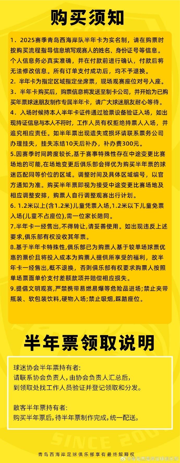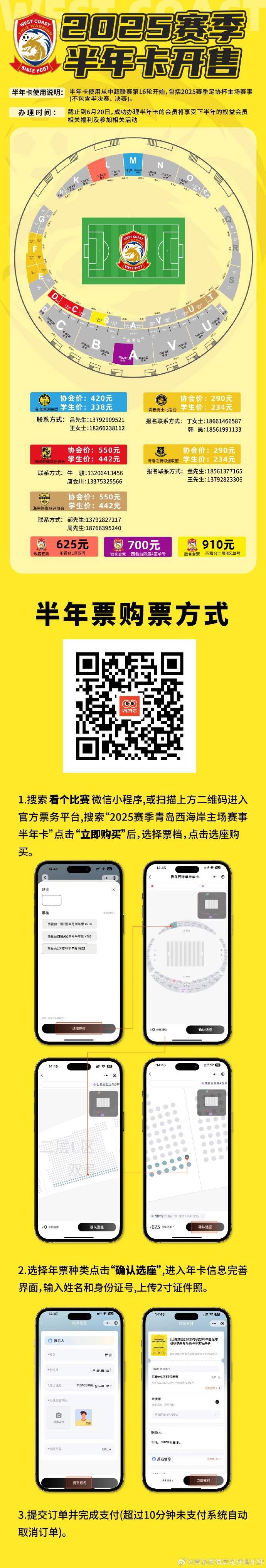 6月14日訊 中超青島西海岸官方消息,俱樂(lè )部發(fā)售2025賽季半年卡。