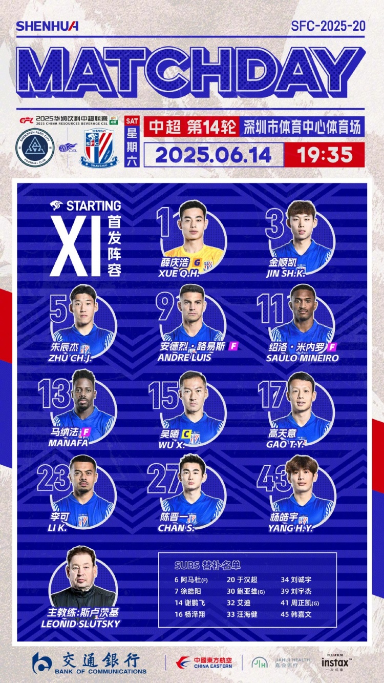 2025華潤飲料中超聯(lián)賽第14輪 深圳新鵬城 vs 上海申花 首發(fā)名單 ???