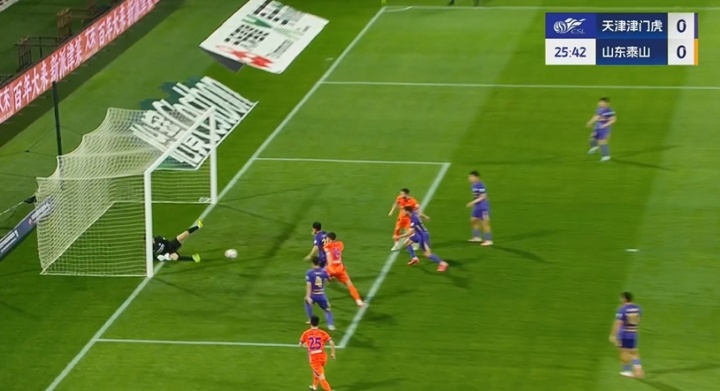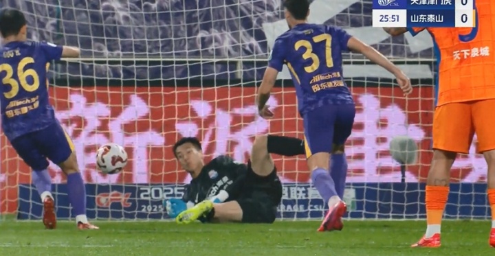 比賽第26分鐘,泰山左路傳中,卡扎伊什維利近距離頭球攻門(mén)被閆炳良神奇撲出。起身后閆炳良對隊友非常不滿(mǎn),示意隊友沒(méi)有盯住人。