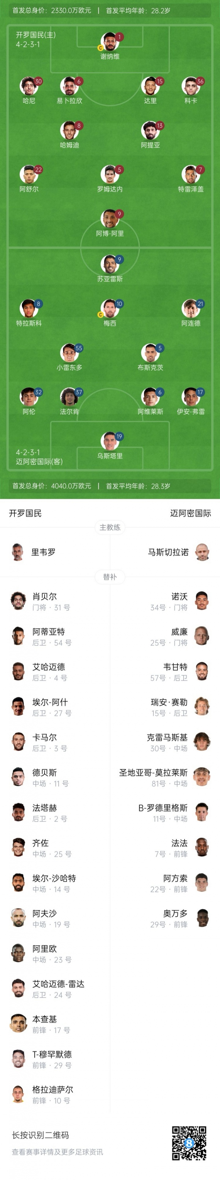 6月15日訊 世俱杯揭幕戰,開(kāi)羅國民對陣邁阿密?chē)H,賽前首發(fā)公布。