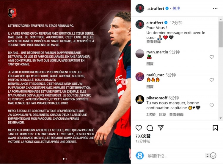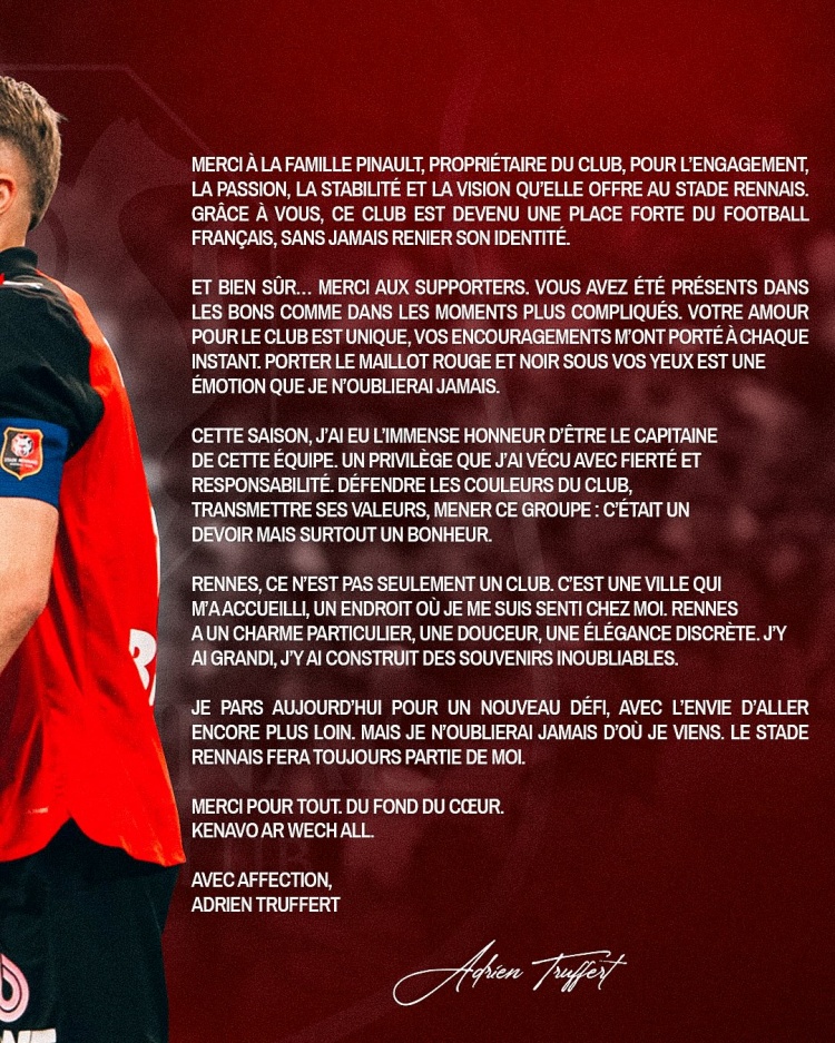 特魯弗特在告別信中寫(xiě)道:“有些篇章在翻過(guò)去時(shí)充滿(mǎn)情感,心頭緊縮,但又滿(mǎn)懷感恩。今天就是這樣的情況。在雷恩度過(guò)了十年之后,我即將翻過(guò)人生中重要的一頁(yè)。