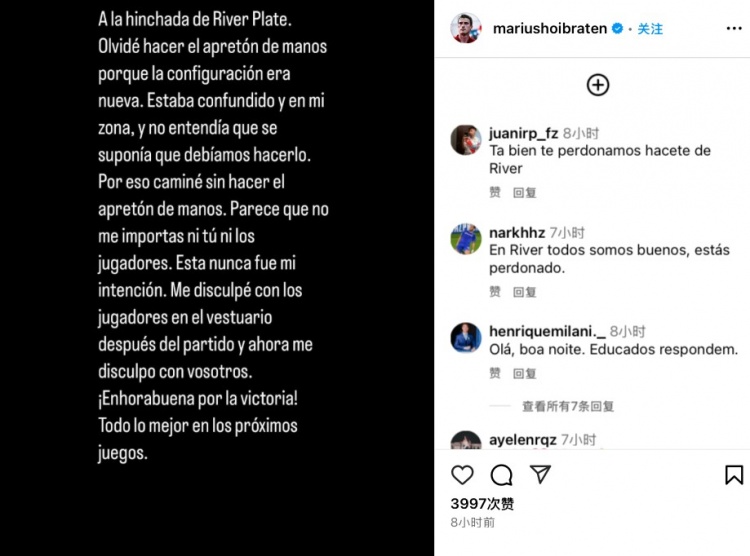 今日霍布拉滕更新社媒,就自己沒(méi)有握手的行為進(jìn)行解釋并向河床球迷致歉,他寫(xiě)道: