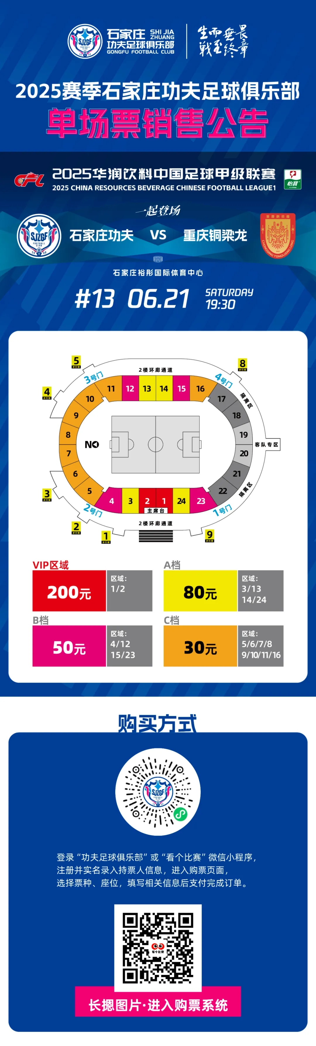 6月21日19:30,中甲第13輪,石家莊功夫將在主場(chǎng)裕彤國際體育中心迎戰重慶銅梁龍,本場(chǎng)比賽票務(wù)將在6月17日10:00正式開(kāi)售。困難的時(shí)候更需要大家的團結,期待我們一起加油吶喊!