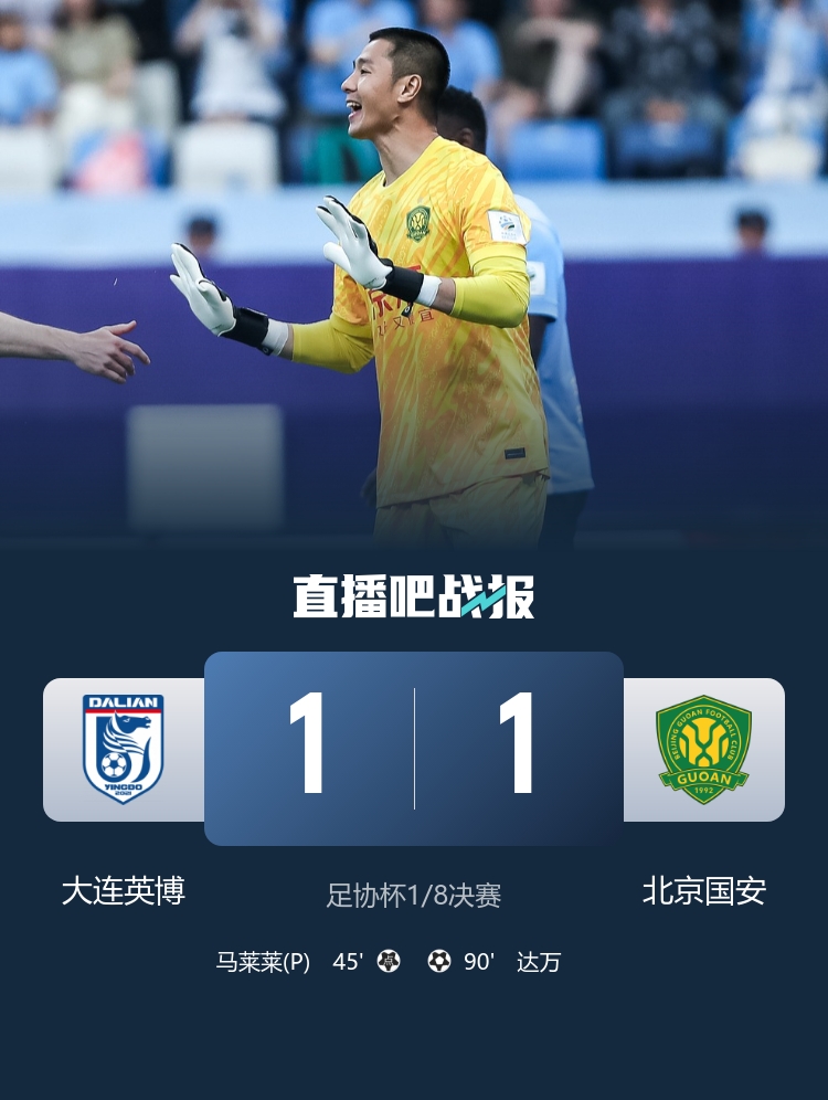 6月21日訊 北京時(shí)間6月21日19:00,足協(xié)杯十六強大連英博迎戰北京國安的比賽在梭魚(yú)灣專(zhuān)業(yè)足球場(chǎng)進(jìn)行,上半場(chǎng)馬萊萊開(kāi)場(chǎng)失良機+屢造險,國安0射正,隨后馬萊萊造點(diǎn)+點(diǎn)射破門(mén),半場(chǎng)結束,大連英博1-0北京國安。下半場(chǎng)達萬(wàn)抽射破門(mén)被吹無(wú)效,隨后達萬(wàn)破門(mén)完成絕平,最終大連英博1-1國安進(jìn)加時(shí),加時(shí)賽達萬(wàn)頭球造險,點(diǎn)球大戰侯森&黃子豪皆2撲點(diǎn),最終國安點(diǎn)球7比6淘汰大連英博晉級八強。
