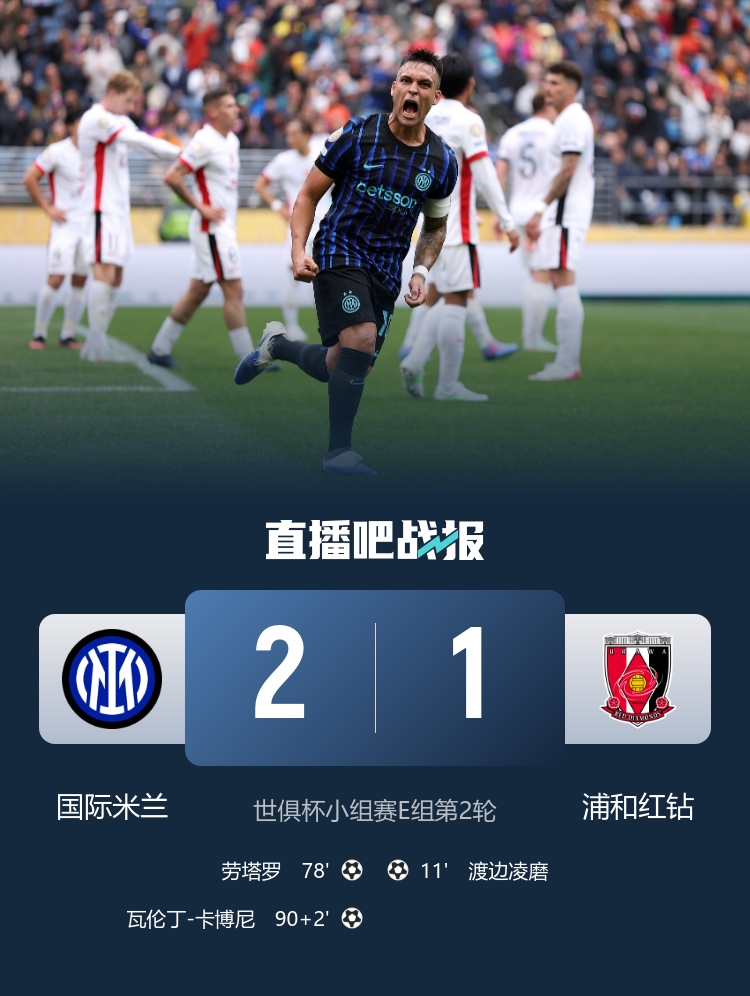 6月22日訊 世俱杯小組賽E組第2輪,國際米蘭對陣浦和紅鉆,比賽在西雅圖流明球場(chǎng)進(jìn)行。上半場(chǎng),渡邊凌磨為浦和紅鉆首開(kāi)紀錄,勞塔羅頭球中楣。易邊再戰,姆希塔良錯失良機,勞塔羅側勾扳平,卡博尼補時(shí)絕殺。最終國際米蘭2-1浦和紅鉆。積分榜方面,國米1勝1平4分暫居榜首,浦和紅鉆兩連敗出局。