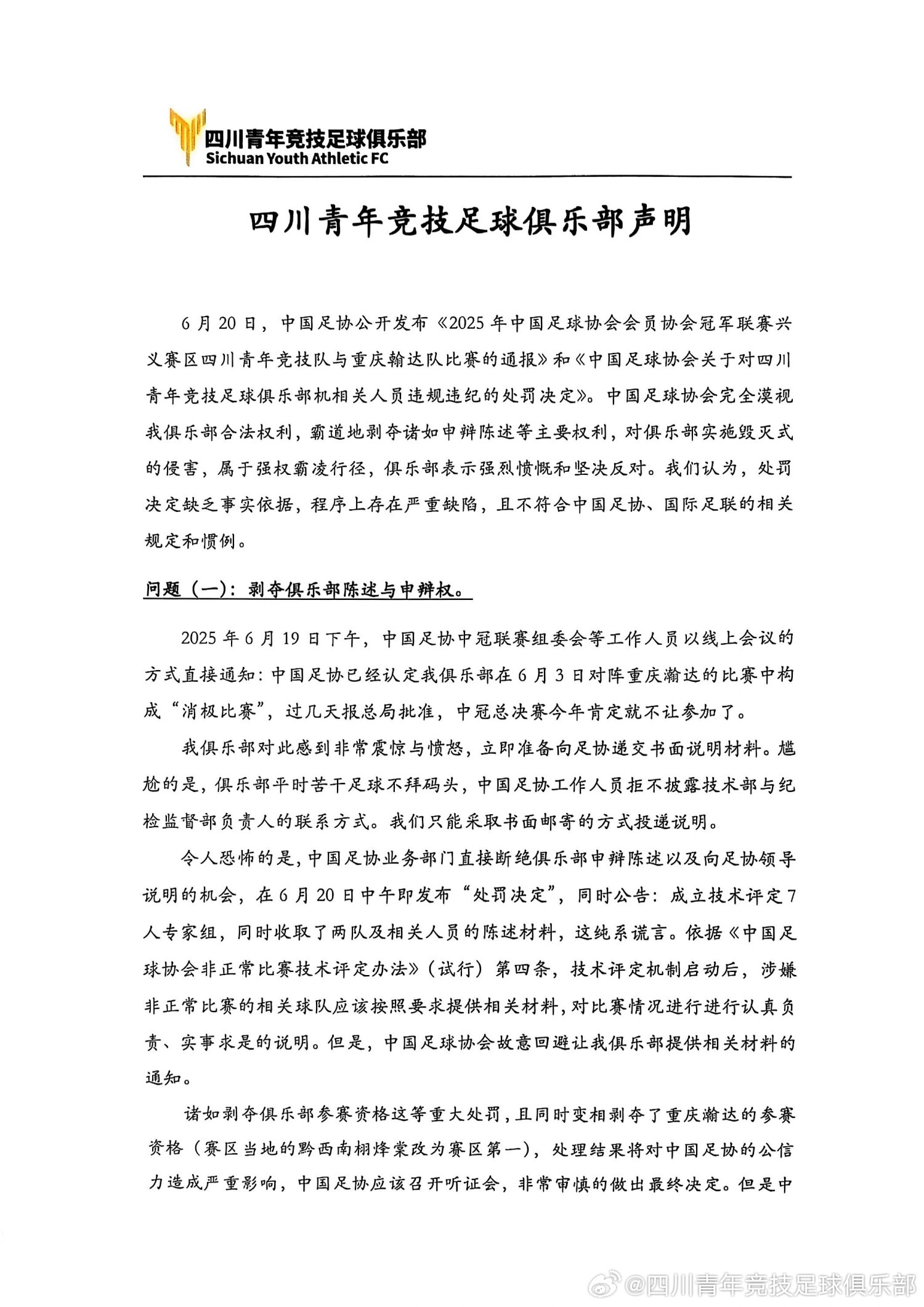 在聲明中,四川青年競技足球俱樂(lè )部表示:中國足球協(xié)會(huì )完全漠視我俱樂(lè )部合法權利,霸道地剝奪諸如申辯陳述等主要權利,對俱樂(lè )部實(shí)施毀滅式的侵害,屬于強權霸凌行徑,俱樂(lè )部表示強烈憤慨和堅決反對。我們認為,處罰決定缺乏事實(shí)依據,程序上存在嚴重缺陷,且不符合中國足協(xié)、國際足聯(lián)的相關(guān)規定和慣例。
