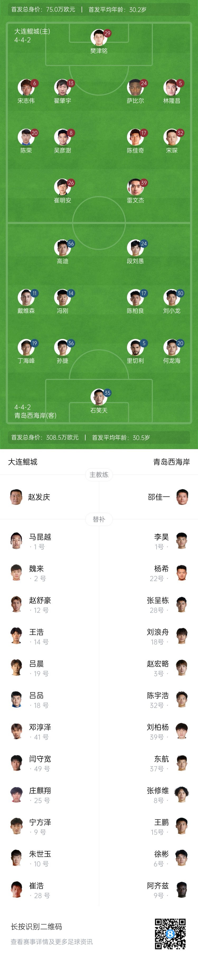 青島西海岸替補:1-李昊、37-東航、3-趙宏略、6-徐彬、18-劉浪舟、22-楊希、28-張呈棟、32-陳宇浩、8-張修維、15-王鵬、9-阿齊茲(F)、39-劉柏楊