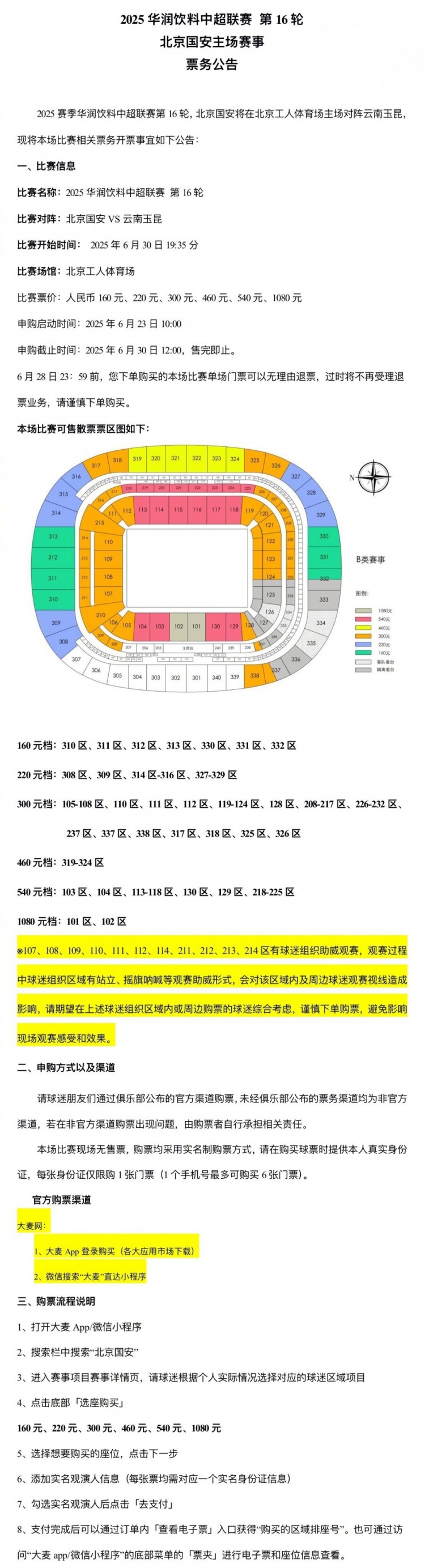 2025賽季華潤飲料中國足球協(xié)會(huì )超級聯(lián)賽第16輪,北京國安將在北京工人體育場(chǎng)主場(chǎng)對陣云南玉昆,現將本場(chǎng)比賽相關(guān)票務(wù)開(kāi)票事宜如下公告,請各位球迷詳細閱讀圖中的公告內容。