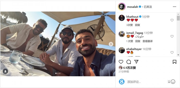 6月22日訊 薩拉赫更新社媒動(dòng)態(tài),曬出與朋友一起度假的照片。