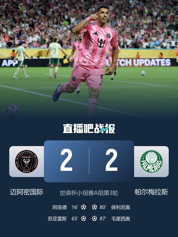 6月24日訊 北京時(shí)間6月24日9點(diǎn),世俱杯A組第3輪,邁阿密?chē)H對陣帕爾梅拉斯。上半場(chǎng),蘇亞雷斯助攻阿連德單刀破門(mén),塞爾克拉傷退,托雷斯錯失良機。下半場(chǎng),阿連德單刀打偏,蘇亞雷斯一條龍得手,保利尼奧和毛里西奧連扳兩球。最終邁阿密?chē)H2-2遭帕爾梅拉斯絕平。小組賽結束,兩隊同積5分攜手晉級,帕爾梅拉斯以?xún)魟偾騼?yōu)勢排小組第一,邁阿密?chē)H小組第二,邁阿密?chē)H將對陣巴黎圣日耳曼。