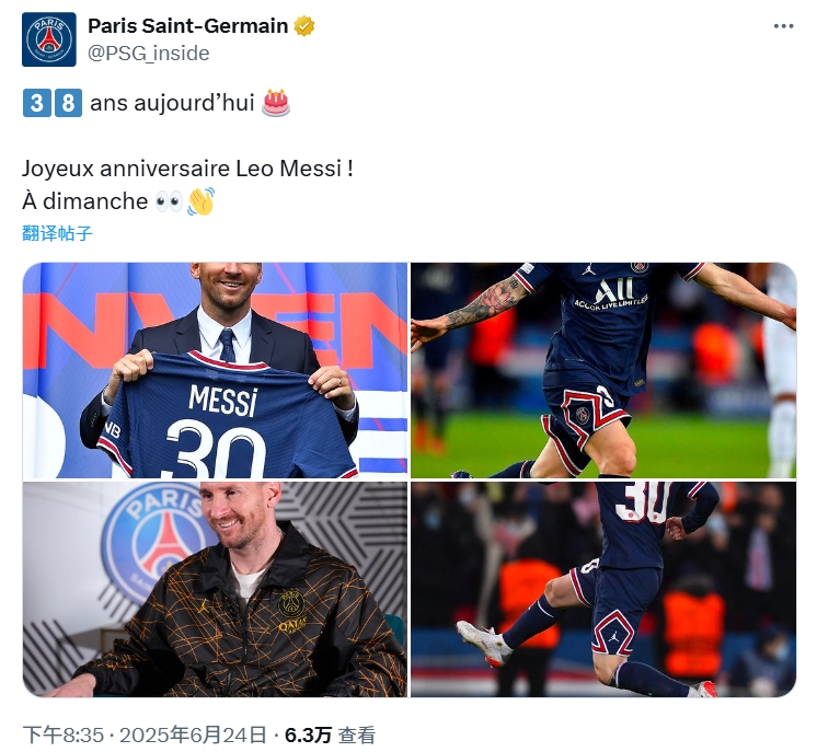 巴黎官推寫(xiě)道:“今天38歲 祝梅西生日快樂(lè )!周日見(jiàn) ????”