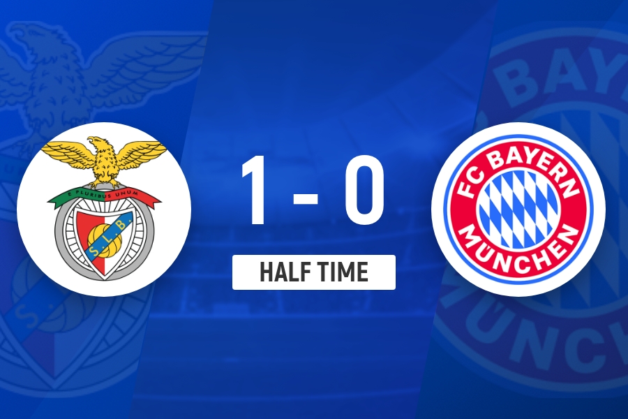 上半場(chǎng)傷停補時(shí)4分鐘,半場(chǎng)結束,本菲卡暫1-0拜仁。