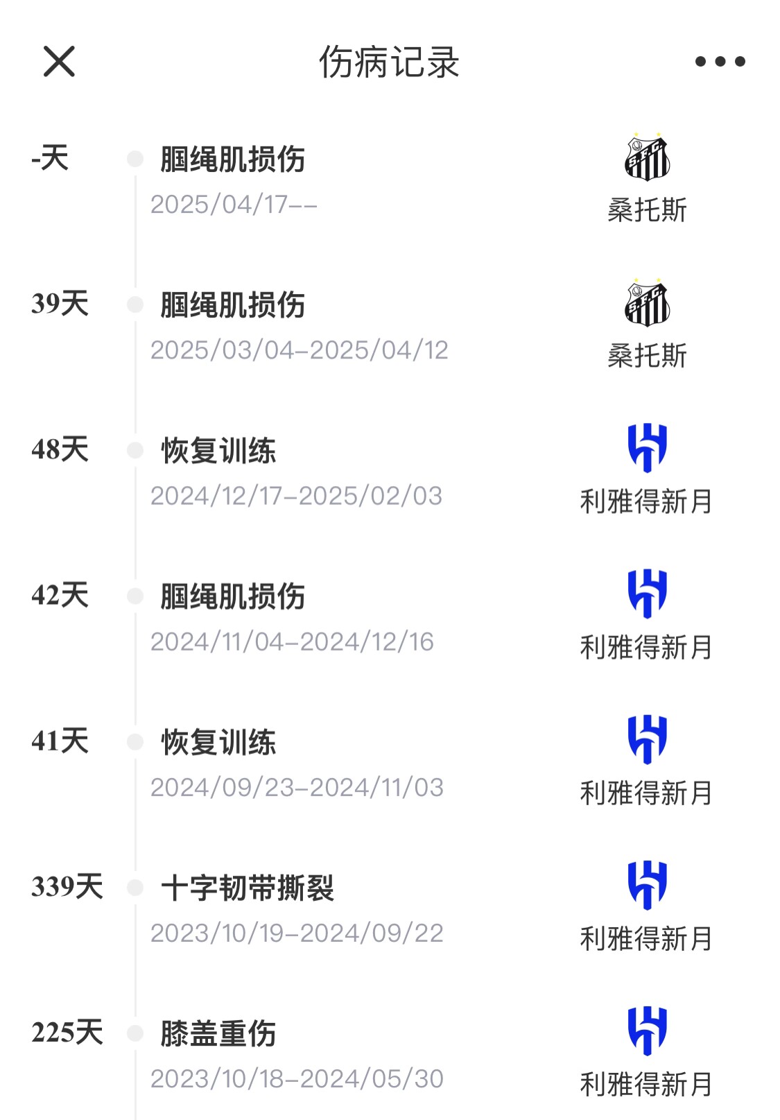 自2023年8月15日從巴黎轉會(huì )至新月后,內馬爾飽受傷病困擾,期間不到兩年的時(shí)間里,內馬爾因為各種傷病問(wèn)題缺席了569天,共計83場(chǎng)比賽,僅出場(chǎng)16次。