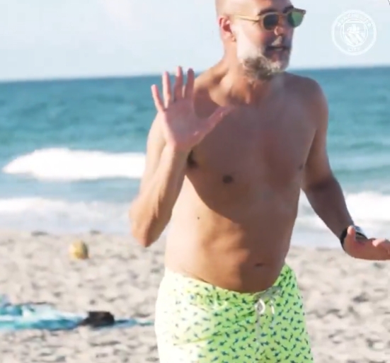 ??幻視龜仙人?54歲瓜帥光膀子穿短褲,與曼城眾將沙灘上顛球