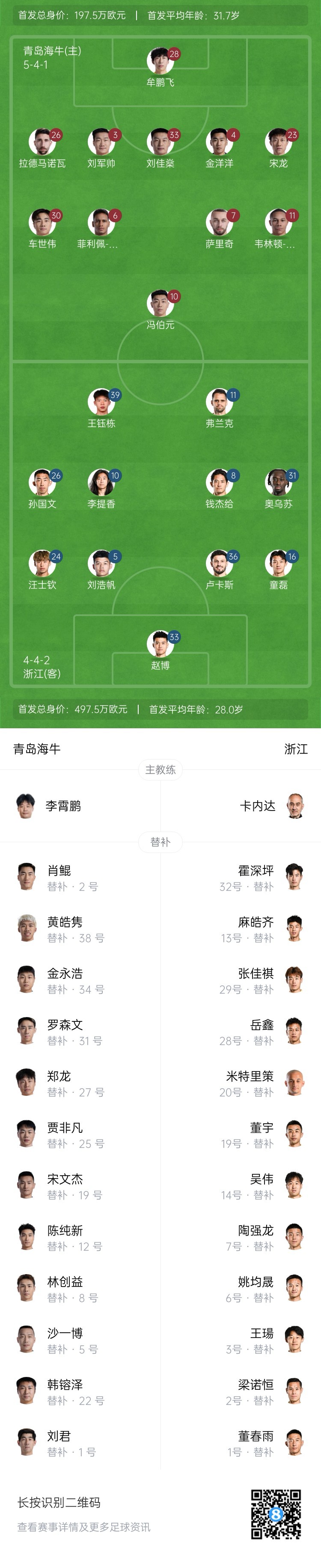 06月25日訊 北京時(shí)間19:00,中超第15輪,青島海牛主場(chǎng)對陣浙江,賽前雙方首發(fā)陣容出爐!