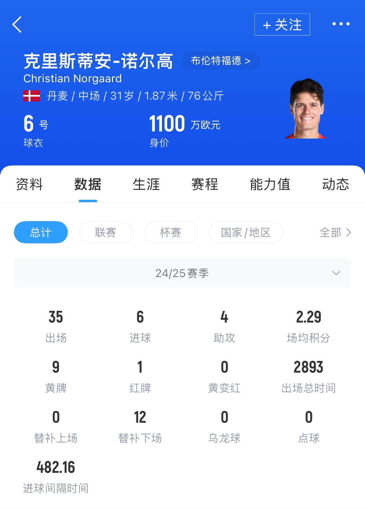 諾爾高現年31歲,丹麥中場(chǎng),上賽季為布倫特福德各賽事出場(chǎng)35次,貢獻6球4助,目前球員德轉身價(jià)為1100萬(wàn)歐元。