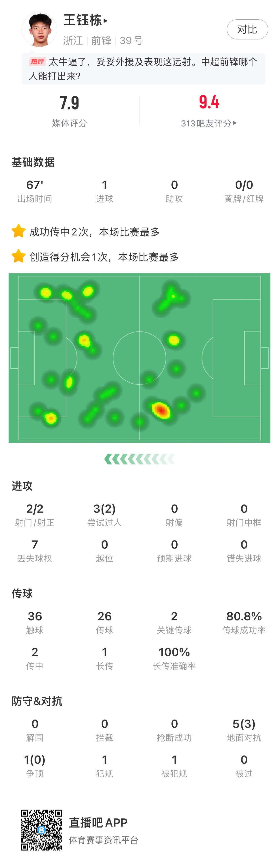 67分鐘傷退??王鈺棟本場(chǎng)數據:2射2正1進(jìn)球 2關(guān)鍵傳球 評分7.9