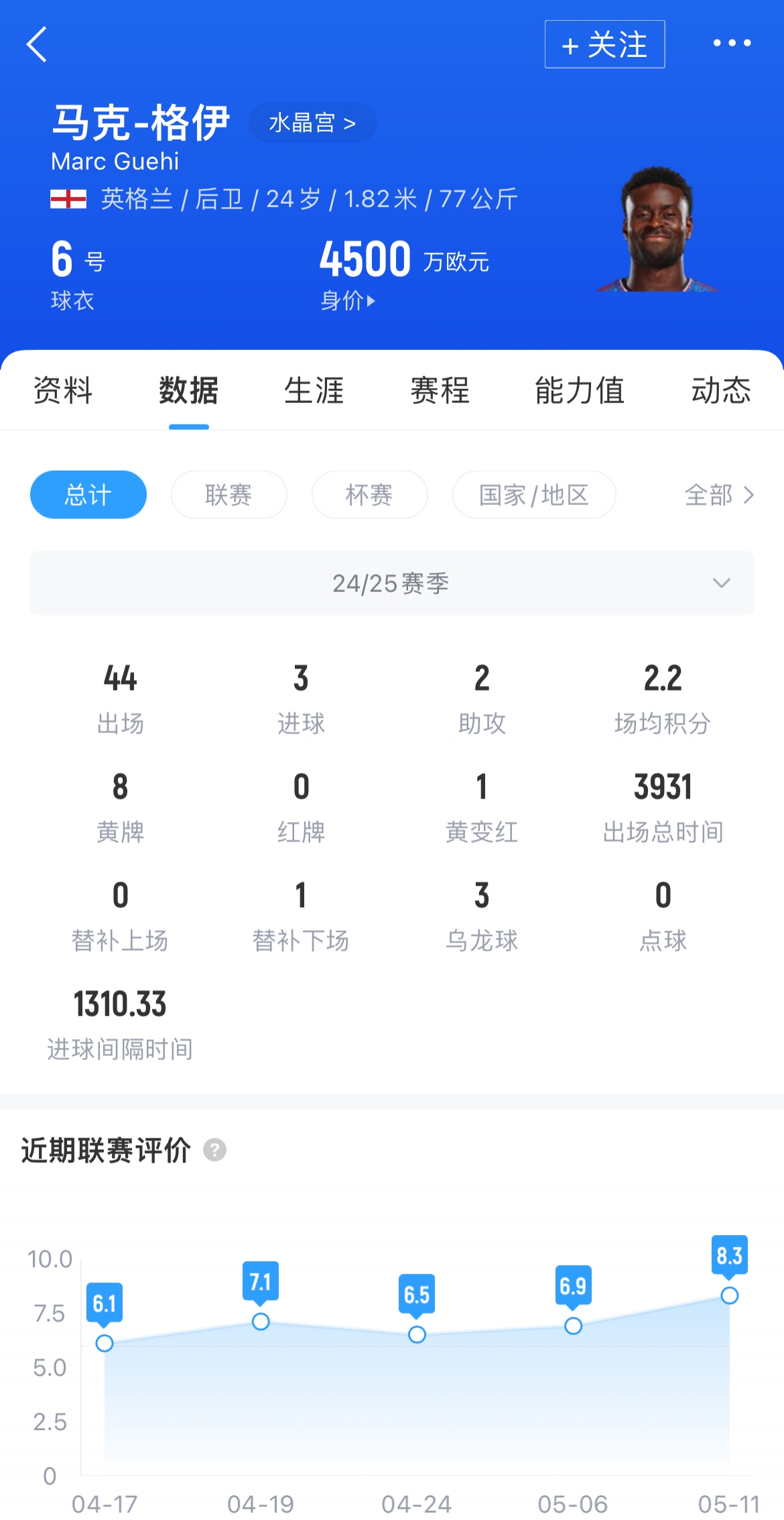 格伊已為英格蘭國家隊出場(chǎng)23次,并肯定將入選明年世界杯的陣容名單。上賽季,他為水晶宮出場(chǎng)44場(chǎng),取得3粒進(jìn)球和2次助攻,目前其德轉身價(jià)為4500萬(wàn)歐元。