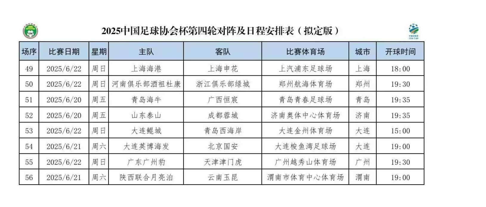 05月29日訊 足協(xié)杯1/8決賽擬定版本賽程出爐,山東泰山vs成都蓉城的比賽被安排在6月20日周五19點(diǎn)35分,上海海港vs上海申花的德比戰暫定6月22日18點(diǎn)開(kāi)球。