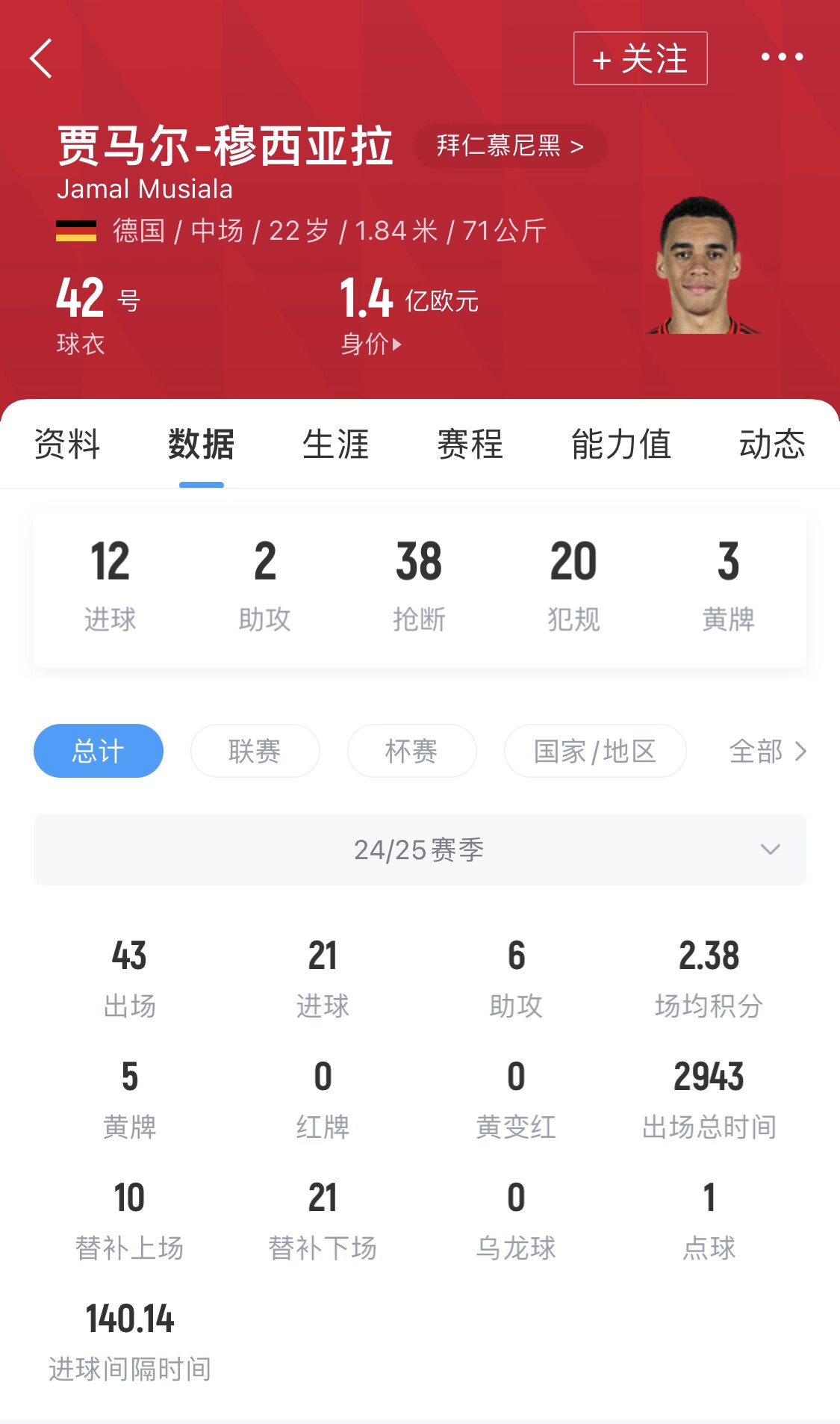 目前一共為拜仁一線(xiàn)隊出戰206場(chǎng),打進(jìn)64球送出39次助攻。24/25賽季出場(chǎng)43次,打入21球并有6次助攻。