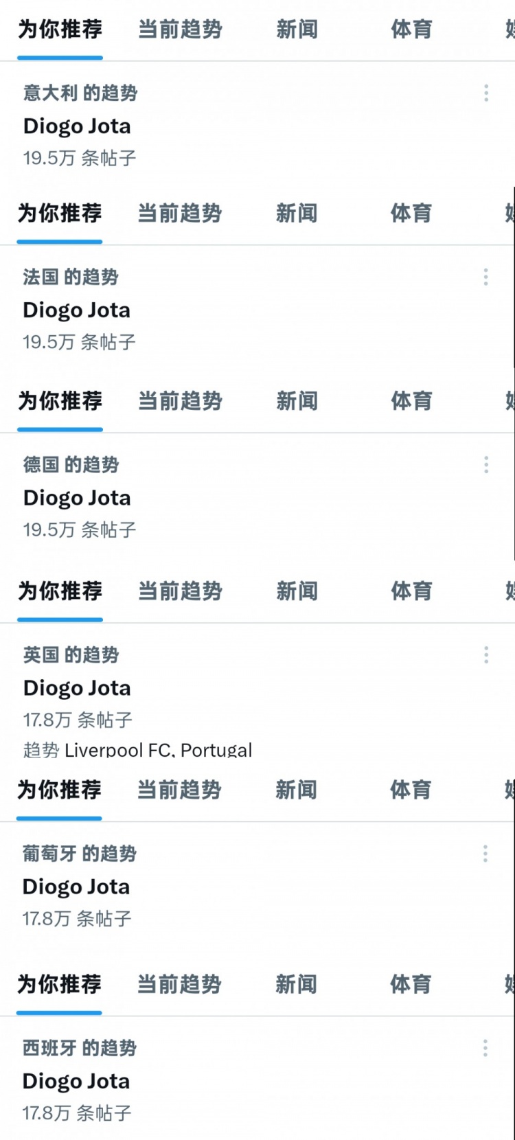 在葡萄牙、英國、西班牙、法國、德國、意大利等多國的X平臺上,迪奧戈-若塔的詞條都排在第一位。