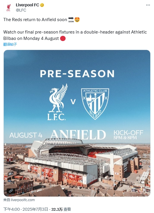 西媒發(fā)布相關(guān)消息的同時(shí),利物浦官方社媒在北京時(shí)間16點(diǎn)整發(fā)布了與畢爾巴鄂競技季前賽的預告,但目前利物浦已刪除預告推文,還未確認若塔的消息。
