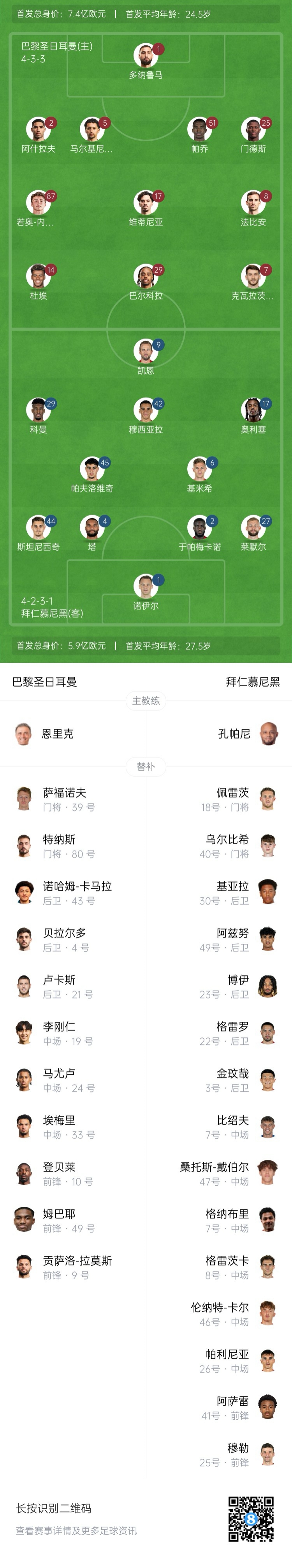 巴黎首發(fā):1-多納魯馬、2-阿什拉夫、5-馬爾基尼奧斯、25-門(mén)德斯、51-帕喬、8-法比安、17-維蒂尼亞、87-若奧-內維斯、7-克瓦拉茨赫利亞、14-杜埃、29-巴爾科拉