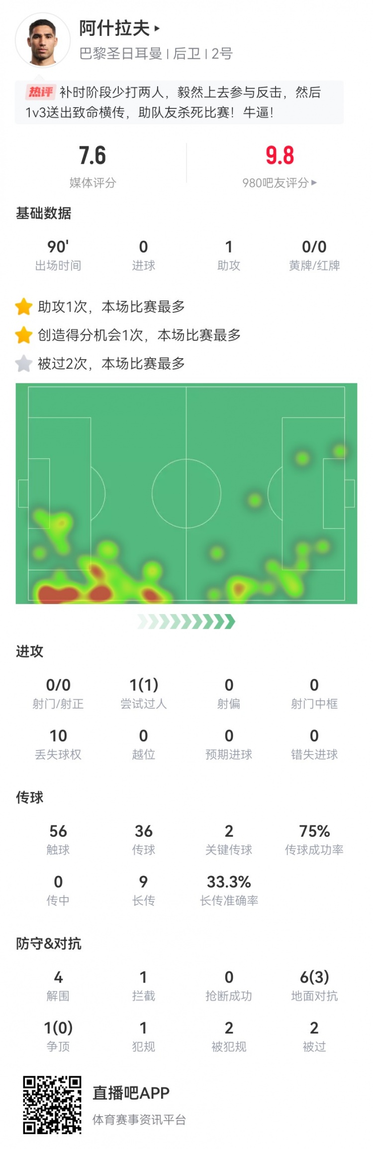 7月6日訊 巴黎在世俱杯八強戰2-0淘汰拜仁,阿什拉夫本場(chǎng)數據如下: