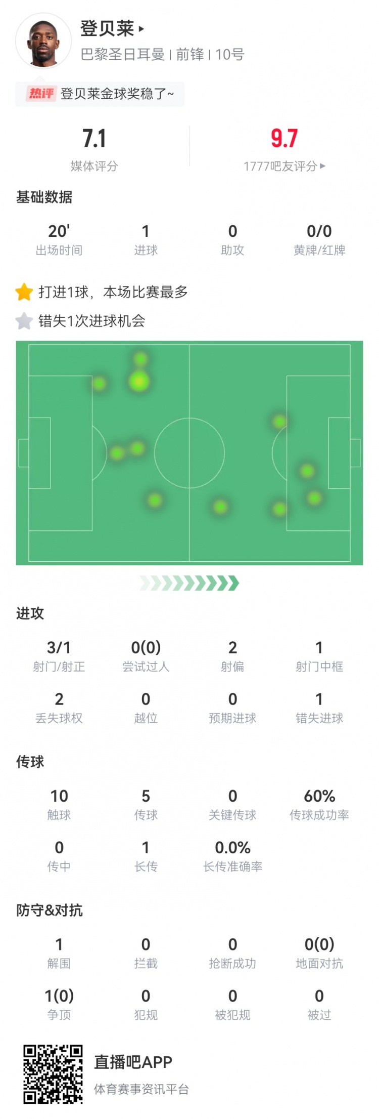7月6日訊 巴黎在世俱杯八強戰2-0淘汰拜仁,登貝萊本場(chǎng)數據如下: