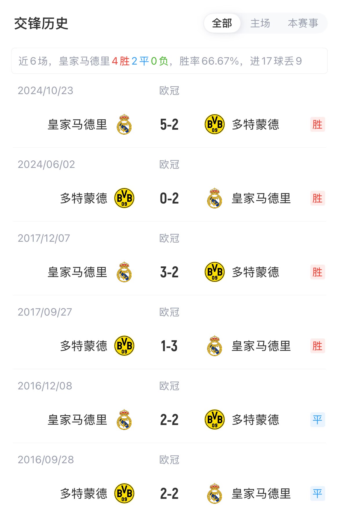 皇馬1/8決賽1-0淘汰尤文,多特則是2-1戰勝蒙特雷?;蜀R與多特共交手16次,皇馬8勝5平3負占據優(yōu)勢,白衣軍團已4連勝、近六場(chǎng)不敗。兩隊上一場(chǎng)對決是上賽季的歐冠聯(lián)賽階段,皇馬5-2逆轉多特。