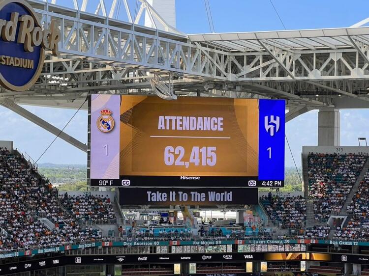 世俱杯小組賽第1輪,皇馬在硬石體育場(chǎng)1-1利雅得新月,現場(chǎng)觀(guān)眾為62415人,球場(chǎng)容量為65000人,上座率96.02%。