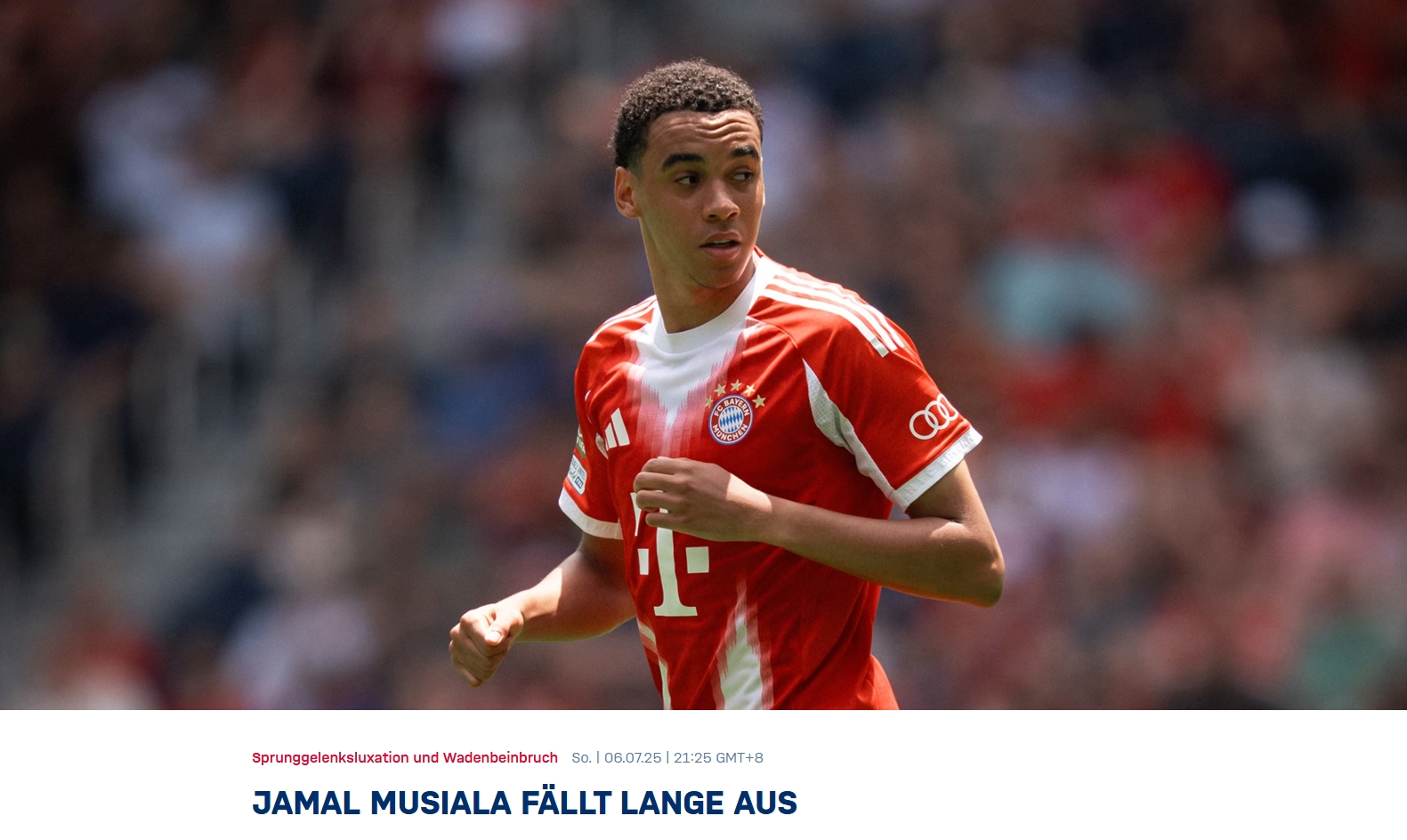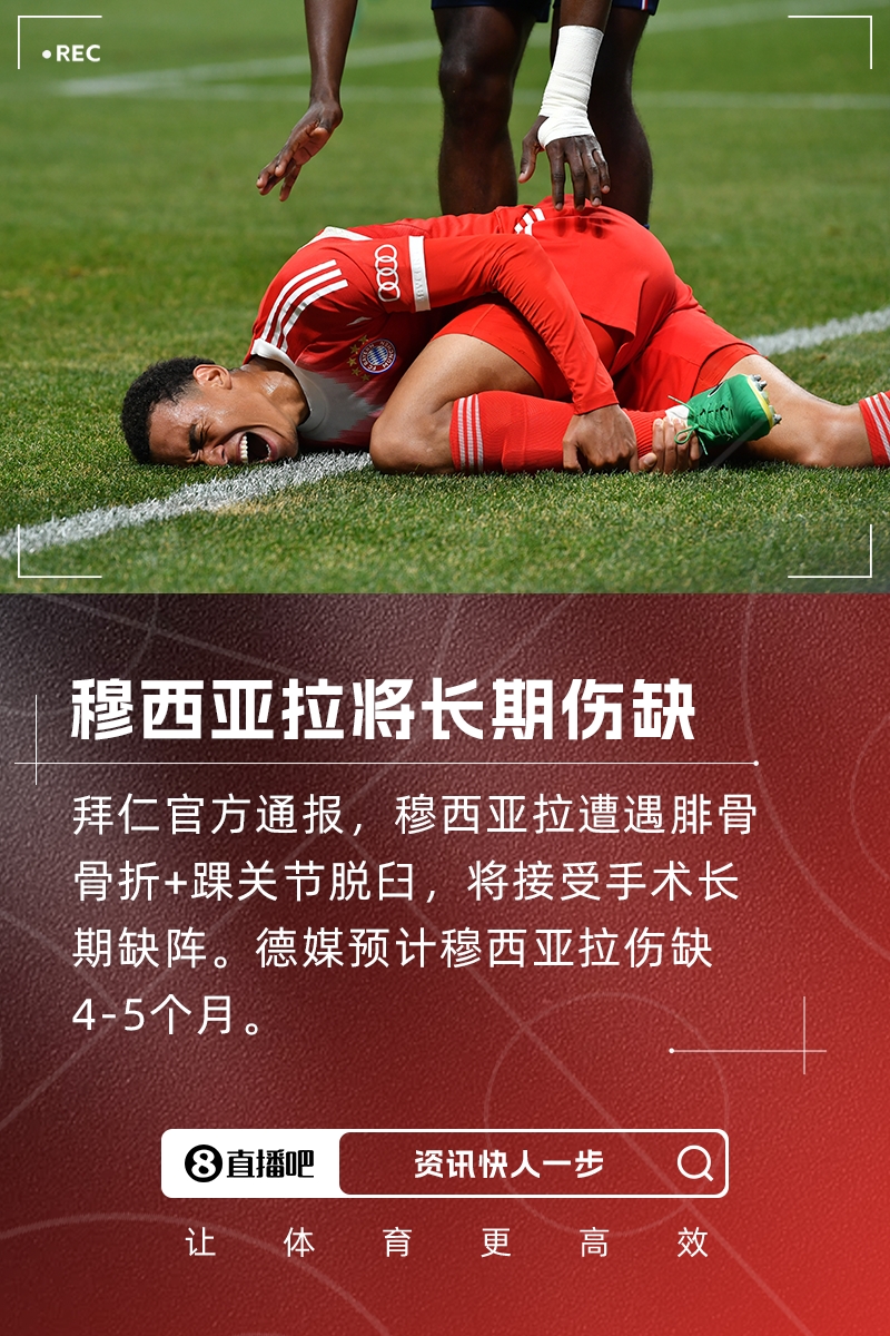 07月06日訊 拜仁官方宣布,穆西亞拉腓骨骨折+踝關(guān)節脫臼,將接受手術(shù)長(cháng)期缺陣。德國媒體此前消息稱(chēng),穆西亞拉預計將傷缺4-5個(gè)月。