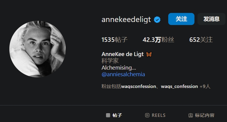 AnneKee還開(kāi)設了新的社媒賬號,名為Annie的煉金術(shù)。在她的主社媒賬號上,她的描述已經(jīng)不再是模特,而是科學(xué)家。