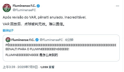07月09日訊 查洛巴禁區內手球被VAR改判取消點(diǎn)球,弗魯米嫩塞官方推特抗議。