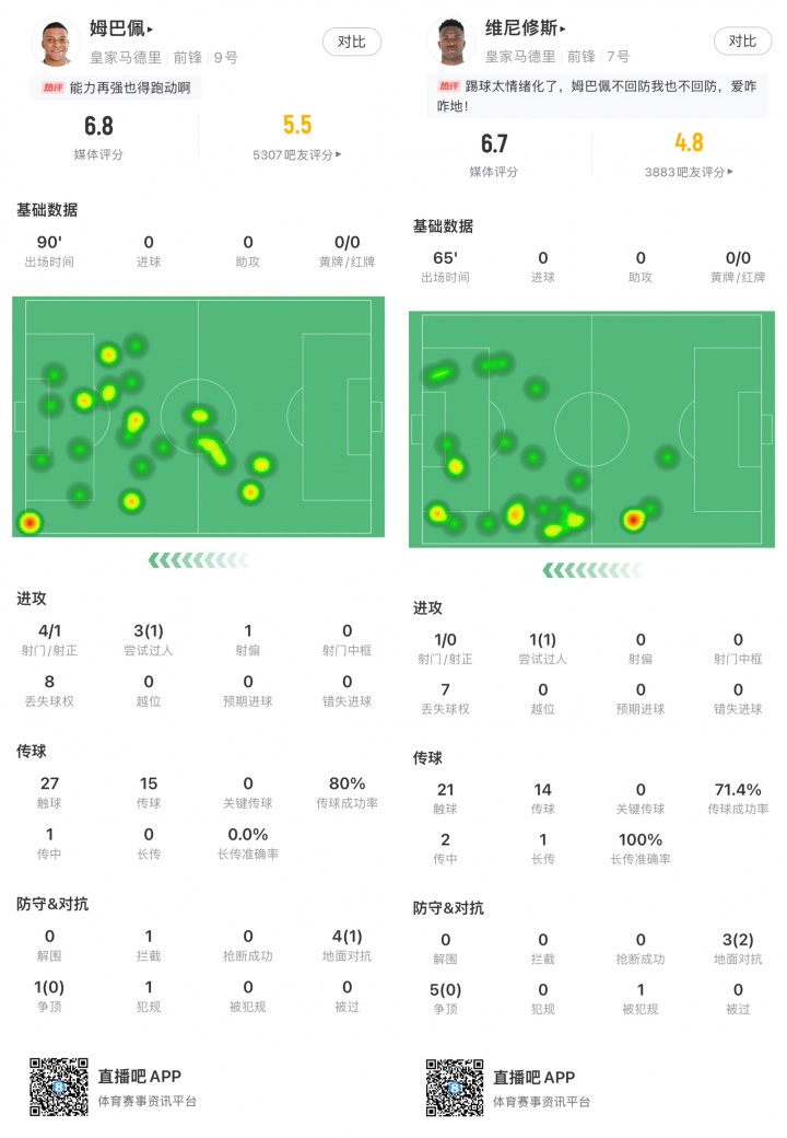 姆巴佩和維尼修斯的數據也解釋了大部分皇馬球迷對他們的不滿(mǎn)。姆巴佩在世俱杯首次首發(fā)中踢滿(mǎn)90分鐘,卻僅完成12次傳球、1次過(guò)人,丟失了8次球權,并且在他與老東家的重逢中,甚至未能獲得一次對手對他的犯規。他僅嘗試一腳射門(mén),并且在參與的5次對抗中只贏(yíng)下了1次。
