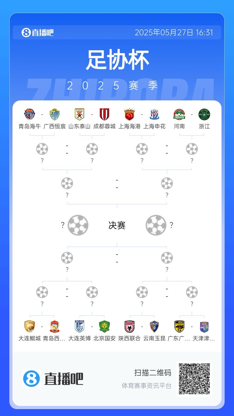 05月27日訊 中國足協(xié)杯16強抽簽結果出爐!海港申花同城德比,泰山與蓉城提前相遇,均在上半區。國安客場(chǎng)對陣英博。西海岸、津門(mén)虎、玉昆抽中中甲球隊,海牛抽中中乙球隊。