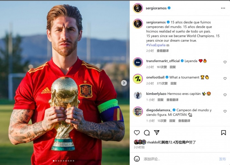 7月12日訊 拉莫斯更新社媒動(dòng)態(tài),紀念2010年隨西班牙隊問(wèn)鼎世界杯。