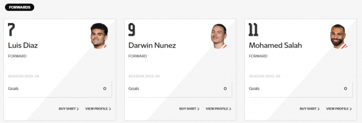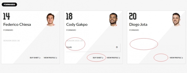 利物浦官網(wǎng)的球員列表,仍保留若塔的資料,但是僅有簡(jiǎn)介,沒(méi)有數據顯示和球衣購買(mǎi)選項。