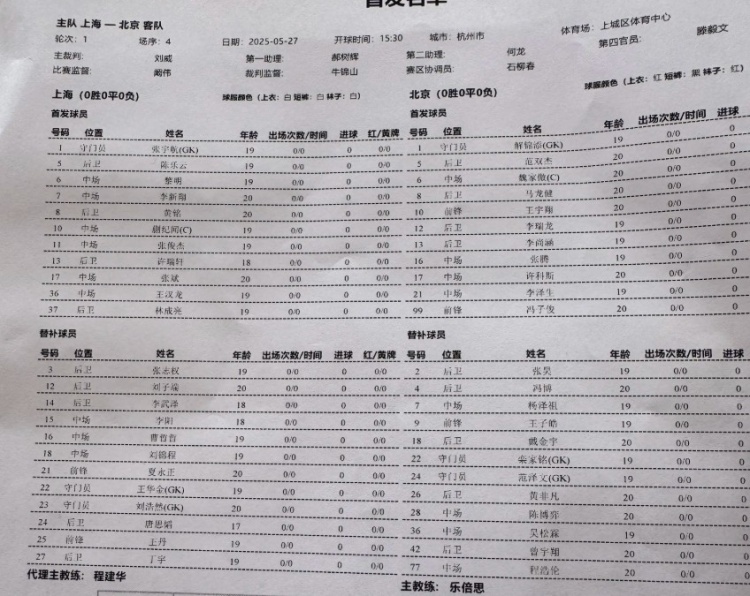 5月27日訊 今天15:30,全運會(huì )男足U20組資格賽A組第一輪,上海隊對陣北京隊,雙方首發(fā)公布,蒯紀聞、李新翔、王漢龍、范雙杰出戰。