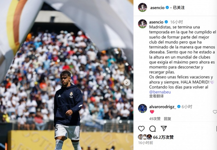 “在世俱杯上,我覺(jué)得自己沒(méi)有達到最佳狀態(tài),這讓我感到遺憾。但現在是時(shí)候放松一下,重新充電了。祝大家假期愉快!無(wú)論現在還是將來(lái),Hala Madrid!期待著(zhù)回到伯納烏的那一天?!?/p>