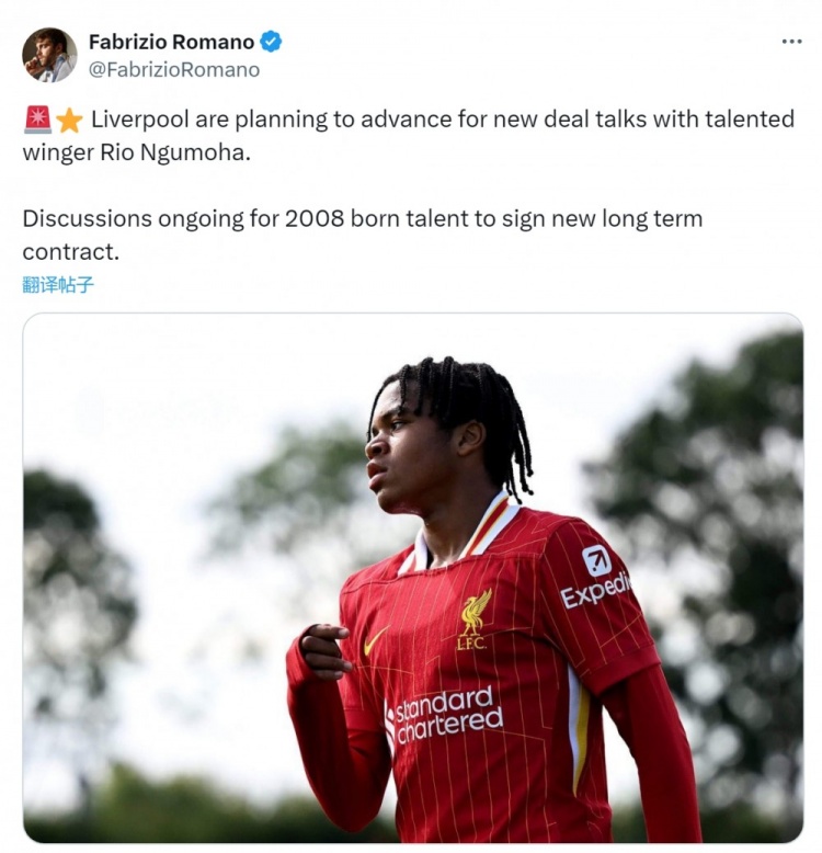 恩古莫哈目前的合同2026年到期,羅馬諾透露,利物浦計劃推進(jìn)這位16歲邊鋒的續約談判,目前雙方正在討論續簽一份長(cháng)期合同。