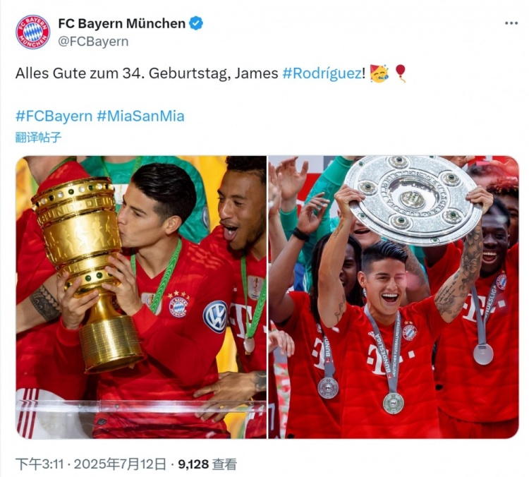7月12日訊 今天是哥倫比亞球星哈梅斯-羅德里格斯的34歲生日,老東家拜仁為他送上祝福。