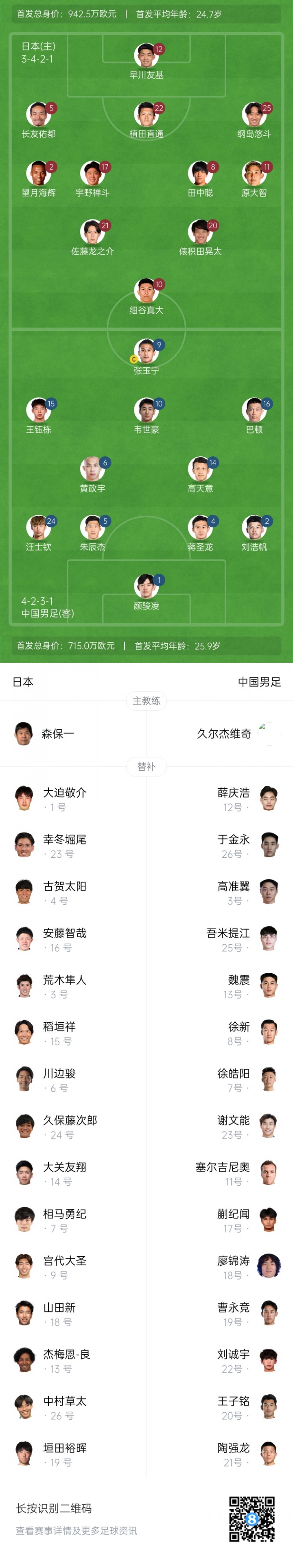 07月12日訊 東亞杯第2輪,國足vs日本首發(fā)出爐。此役國足首發(fā)平均年齡25.9歲,身價(jià)715萬(wàn)歐,日本首發(fā)平均年齡24.7歲,身價(jià)942.5萬(wàn)歐。